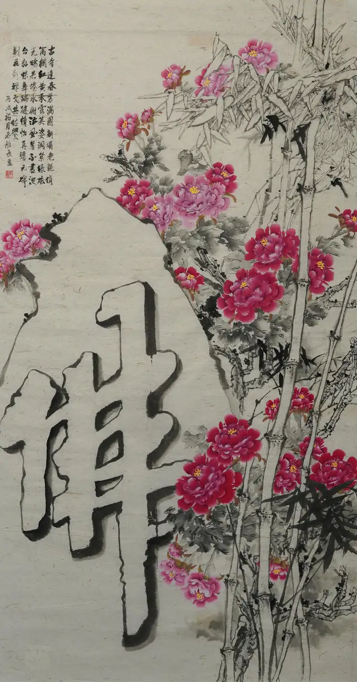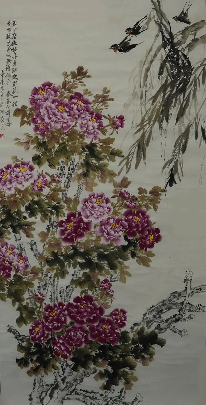王家华先生是一位有造诣的画家。在中华民族传统文化的创作领域中,名家大师大多习惯于用意象来构建意境,例如梅、兰、竹、菊等等。而王家华先生则对牡丹花情有独钟。牡丹花素来被誉为“国花”,色彩丰富、雍容华贵,深受国人的喜爱,也是中国花鸟画中最常见的表现题材,最早可追溯到北齐时期。唐代韦绚在《刘宾客嘉话录》中说“北齐杨子华画有牡丹”,这是关于牡丹绘画的最早记载。牡丹已被历代画家演绎了1500多年,每个时期的牡丹都有各自的风格,不同的文化内涵,在众多牡丹艺术的代表作中,既有展示庙堂之高的夺目奢华,也有反映志节高远的“水墨丹彩”,既有富商巨贾的大红大紫,也有闲云野鹤的清淡人生。
